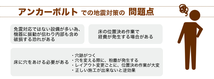 床の劣化を招く恐れがあります 耐震アンカー(設備アンカー)の穴をあけた所から水分・塩化物・酸性物質などが入り込む事により、床の劣化を招く恐れがあります。 ※古い工場の中には、コンクリートが薄かったり硬度が低い可能性があるため、耐震アンカー(設備アンカー)の利きが弱くなるといわれています。