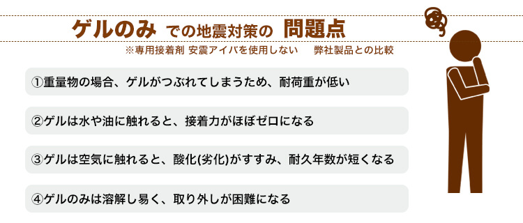 通常の耐震アンカー(設備アンカー)での施工では、床の強度が影響することに対し、安震アジャスターは表面の強度は必要になりますが、比較的床の強度には影響を受けません。 また、一般的なゲルは耐荷重が少なく、耐荷重を上げるには大きさが必要ですが、安震アジャスターのゲルは工業専門製品なので、コンパクトでなおかつ一般と並べて約10倍の耐荷重があります。