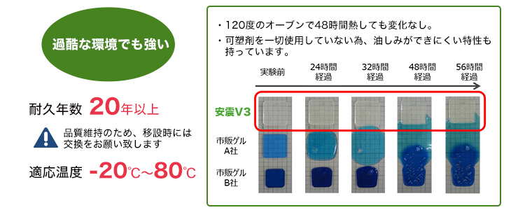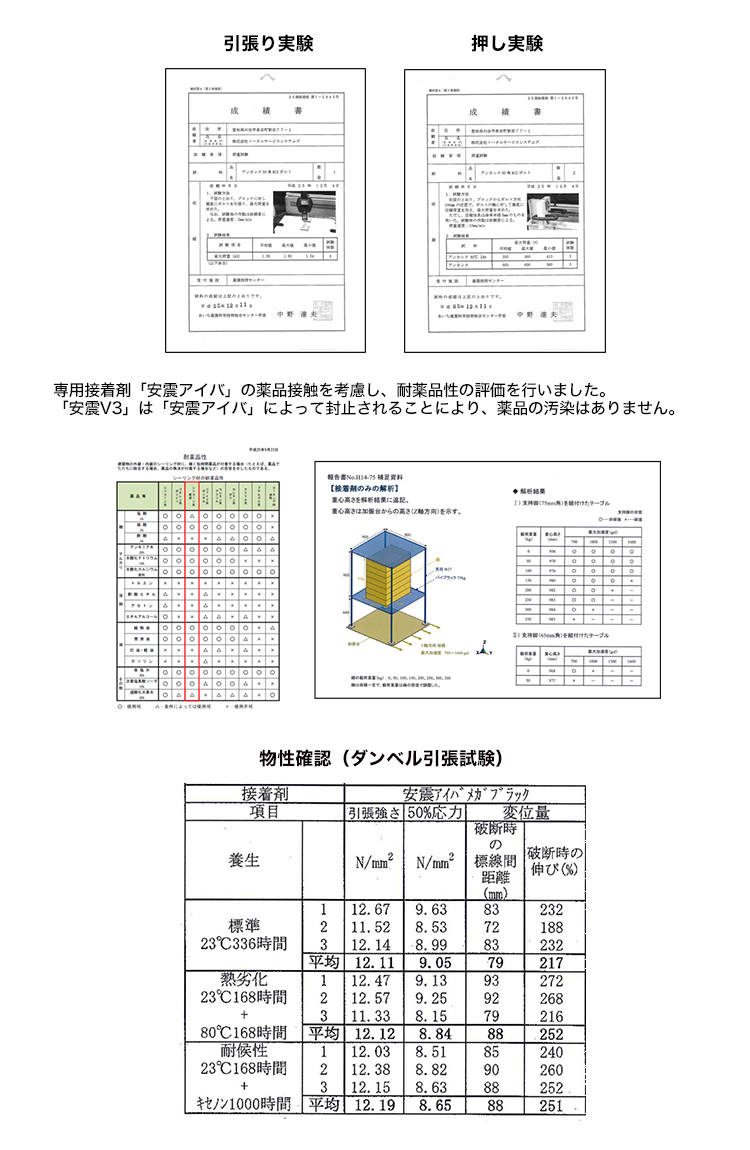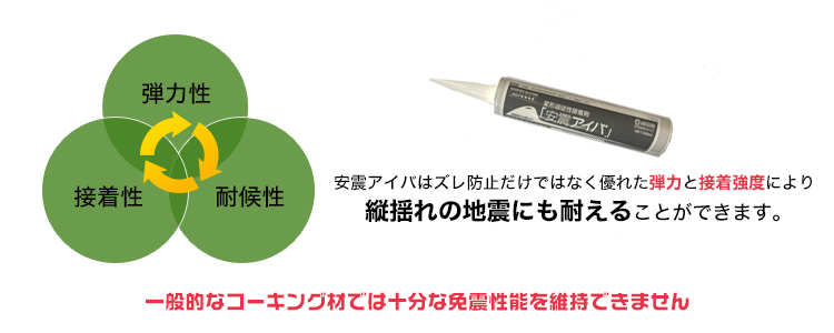 「安震アイバ」の素材は変成シリコン樹脂です。 「安震アイバ」を併用することにより、微調整も可能になり、振動と衝撃吸収効果が増します。 弾力性、耐候性、接着性に大変優れており、変形追従性の特徴を持つため、硬化後も弾力があります。