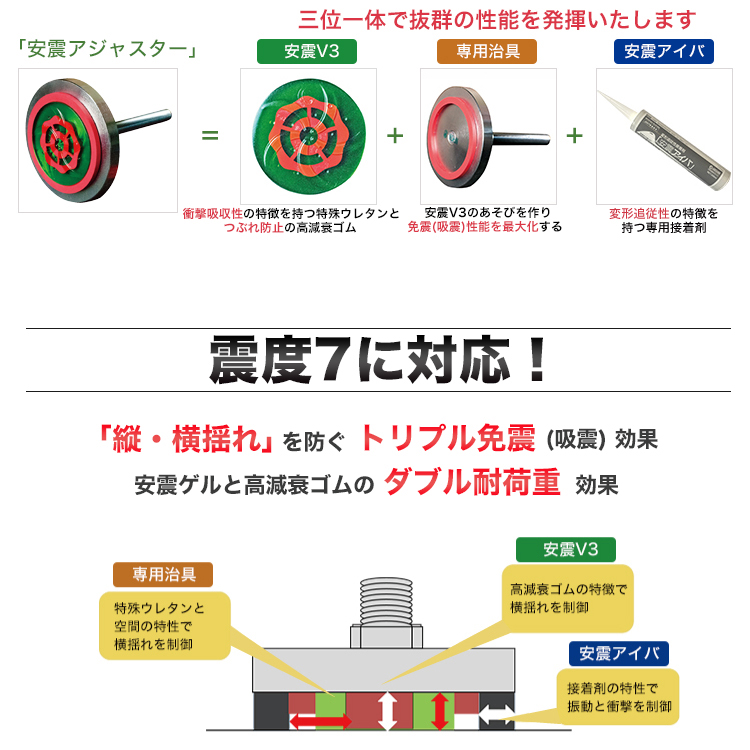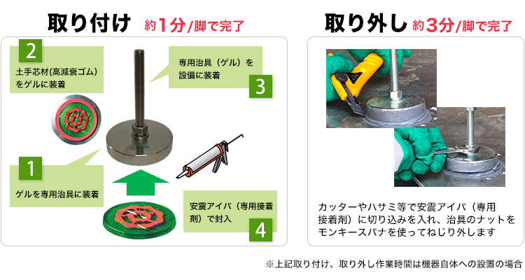 ② 専用治具は、繰り返し使用できます。 ・治具は繰り返し使用可能 ・安震ゲル・専用接着剤は再施工毎に交換国際特許取得